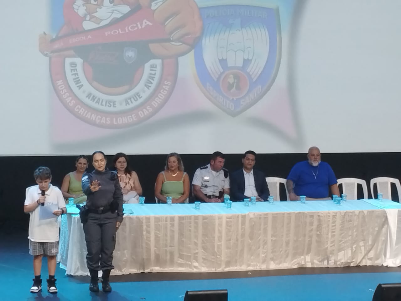 Dando sequência à programação da formatura, os estudantes que se destacaram em suas redações foram chamados à frente do palco para realizarem suas leituras e serem homenageados. Também houve a leitura do juramento, com cada aluno erguendo seu braço direito, e uma apresentação teatral, encenando os aprendizados do currículo do 7º ano, mostrando ao público como as drogas são oferecidas nas ruas, e como ela precisa ser combatida.