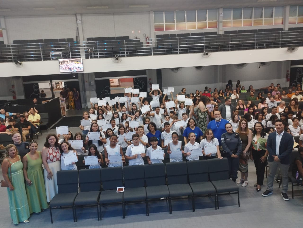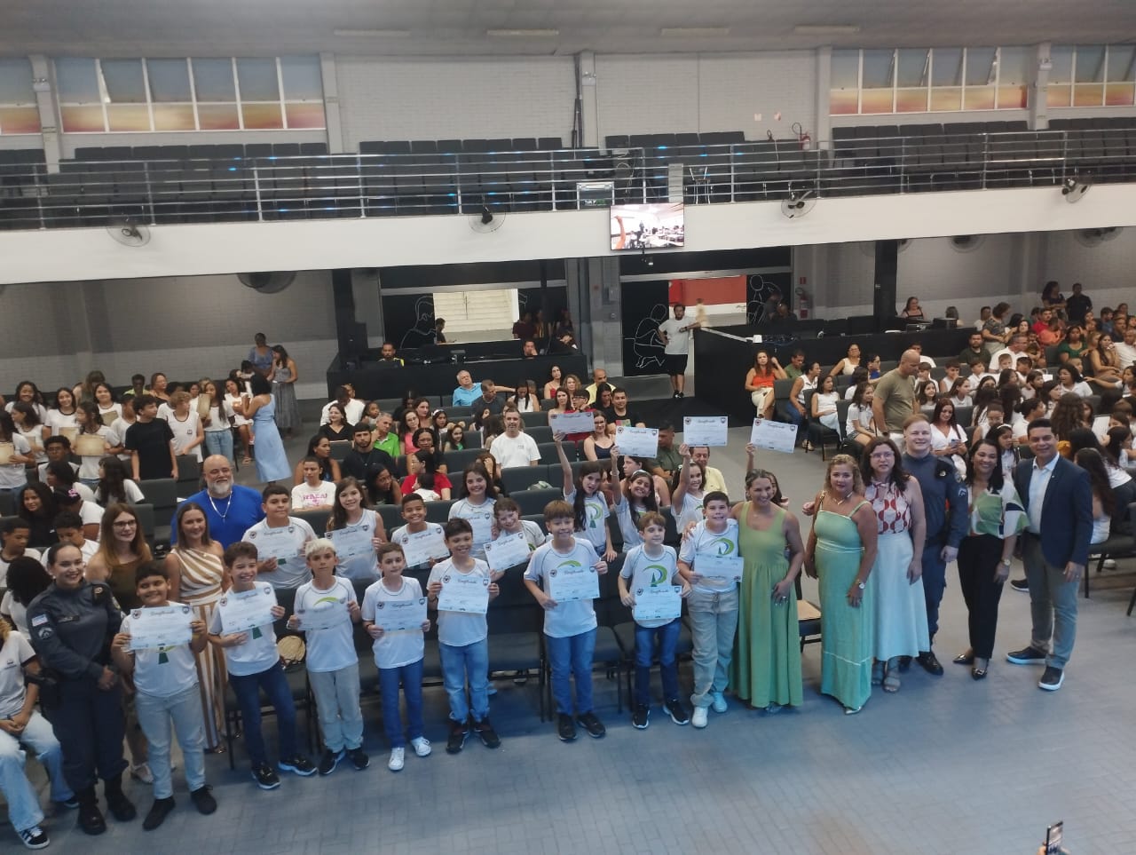 Dando continuidade às formaturas do Programa Educacional de Resistência às Drogas (Proerd), no 2º semestre de 2025, a Secretaria Municipal de Educação (Semed) da Prefeitura de Aracruz, em parceria com o 5º Batalhão de Polícia Militar (5BPM), promoveu na noite desta terça-feira (2), no Auditório do Pibara, uma grande cerimônia de certificação com 530 estudantes dos 7º anos das Emef´s Ezequiel Fraga Rocha, Luíza Silvina e Placidino Passos. Na ocasião, alunos dos 5º anos das escolas particulares Centro Educacional Pensar e Centro Educacional Aracruz (CEA) também receberam seus certificados.