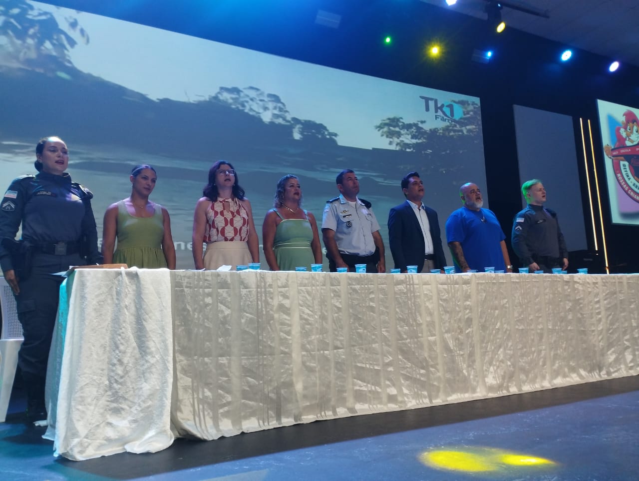 Compuseram a mesa de honra o Comandante do 5º BPM, o tenente-coronel Márcio Cunha Cabral; o vereador e cabo da reserva remunerada Alex Hander Pereira Daniel; a secretária da Semed, Jenilza Spinassé Morellato; a diretora do CEA, Adriana Recla Sarcinelli; a coordenadora do Centro Educacional Pensar, Karla Lorena Vargas Naettzel Percílios, o representante dos gestores das instituições de ensino da Rede Municipal de Ensino, o diretor Ricardo de Oliveira Silva; além dos instrutores do Proerd, os Cabos PM Mártin Vesfál Kelbert e Jennifher Vieira.