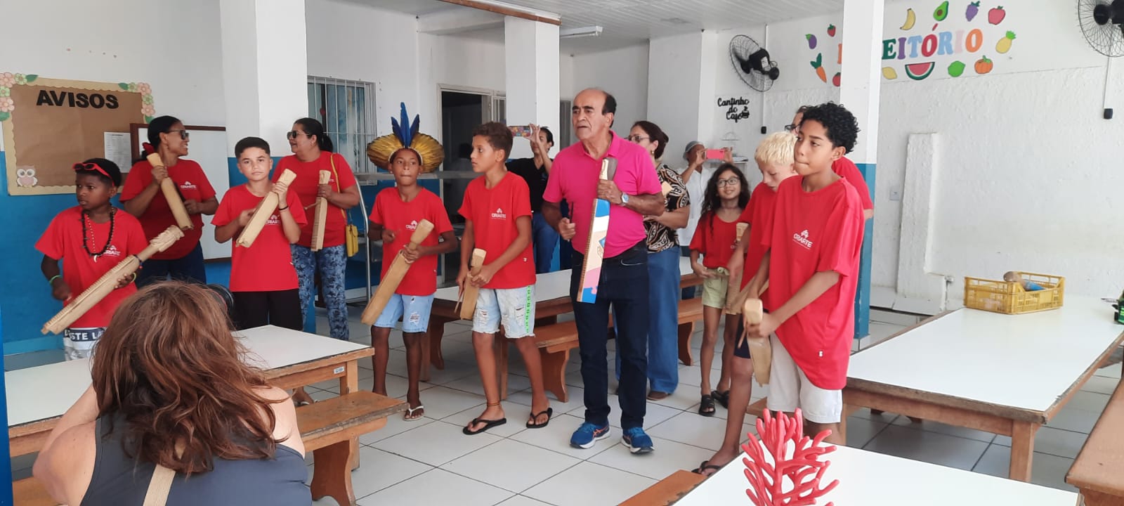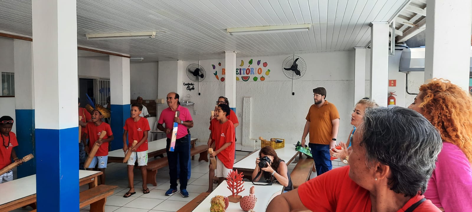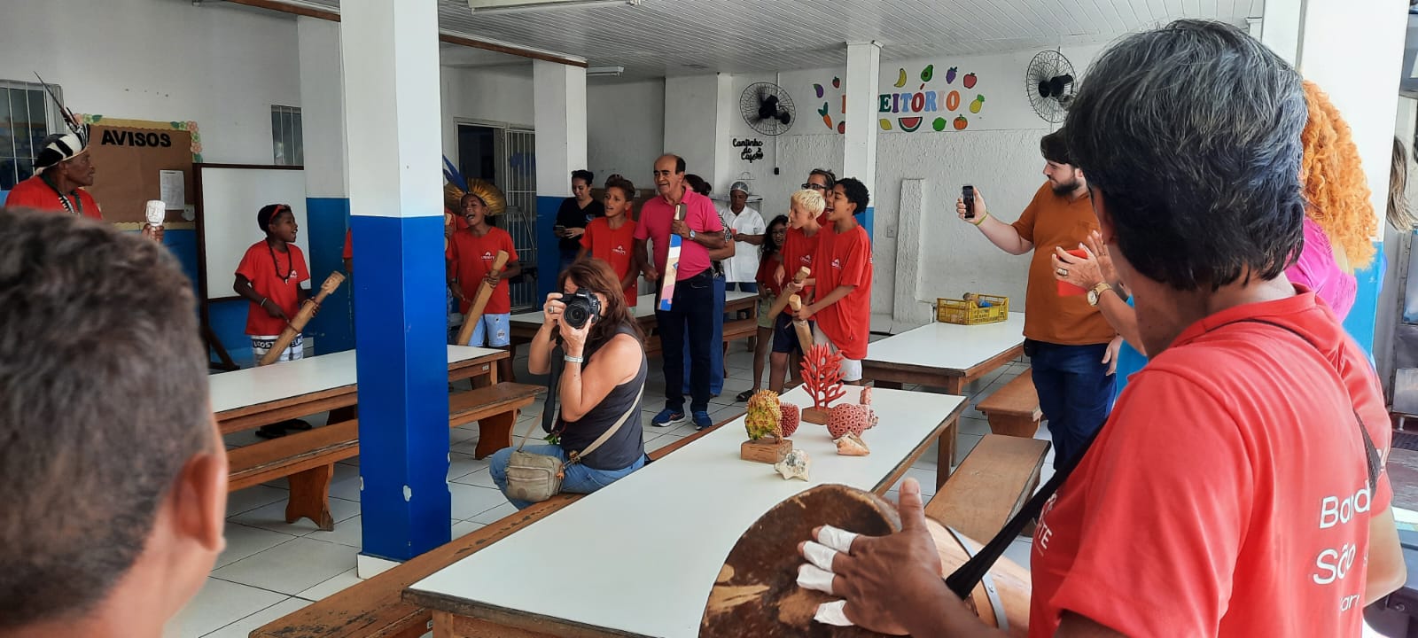 A primeira escola visitada foi a EMPI Irajá, onde, na ocasião, as crianças estavam prestigiando e aprendendo com as ações lúdicas do Baú da História, uma iniciativa apoiada pelo Ministério da Cultura e empresa Imetame. Os estudantes também fizeram uma demonstração de uma roda de dança indígena, cantando na língua nativa, Tupinikim.