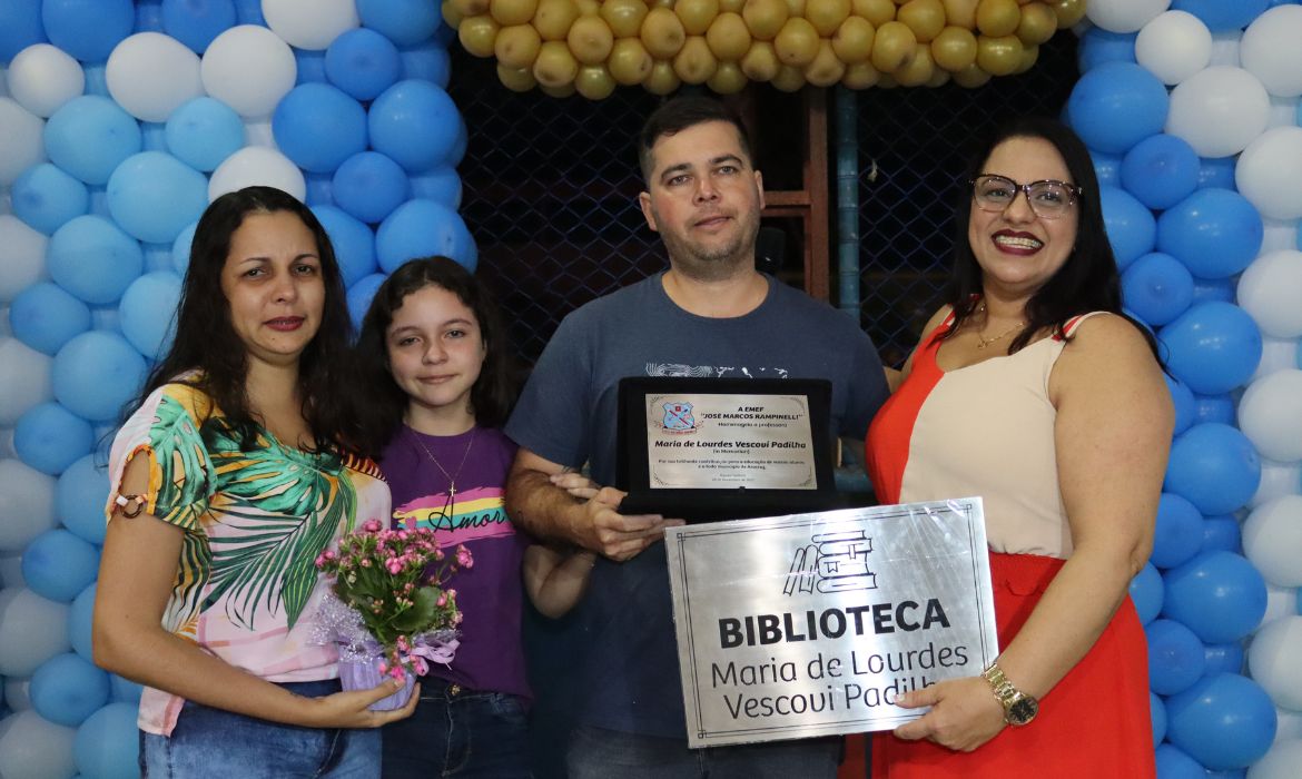 Em um dos momentos mais emocionantes da noite, a escola fez uma grande homenagem à professora Maria de Lourdes Vescovi Padilha, falecida no dia 29 de janeiro deste ano. Seus familiares foram chamados ao centro quadra pare receber uma placa. Agora, a biblioteca da escola tem o nome da professora, que por lá trabalhou por mais de dez anos. “Seu trabalho sempre foi desenvolvido com alunos em processo de alfabetização nos primeiros anos. Ela se destacou com a ação ‘Dia de Princesa’, valorizando as crianças que se motivavam para aprende a ler. Dada sua importância, resolvemos fazer essa homenagem imortalizando seu nome em nossa biblioteca, disse a diretora Marta Aiolfi.