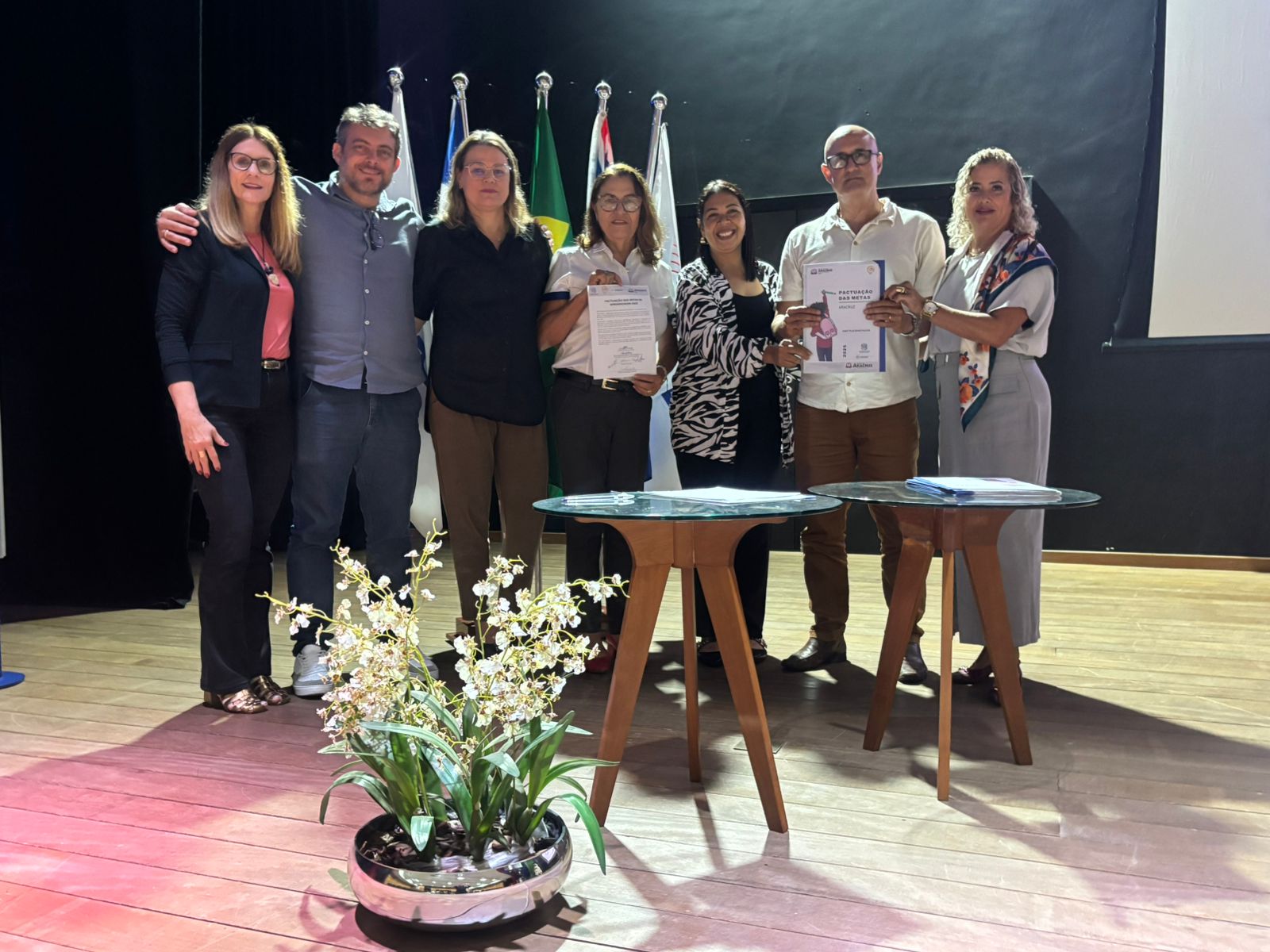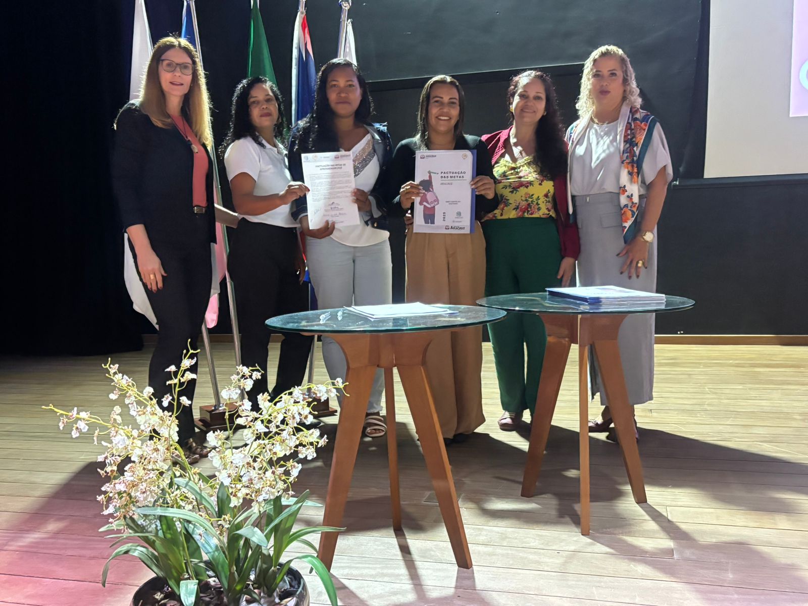 O ponto mais alto da cerimônia foi o momento da pactuação. Para simbolizar essa união de propósitos e formalizar o compromisso com os objetivos estabelecidos para 2025, os representantes de cada instituição, acompanhado das técnicas referências da Semed subiram ao palco e assinaram o documento, que vem para traduzir em ações concretas, resultados efetivos e, sobretudo, em esperança renovada nos caminhos da aprendizagem.