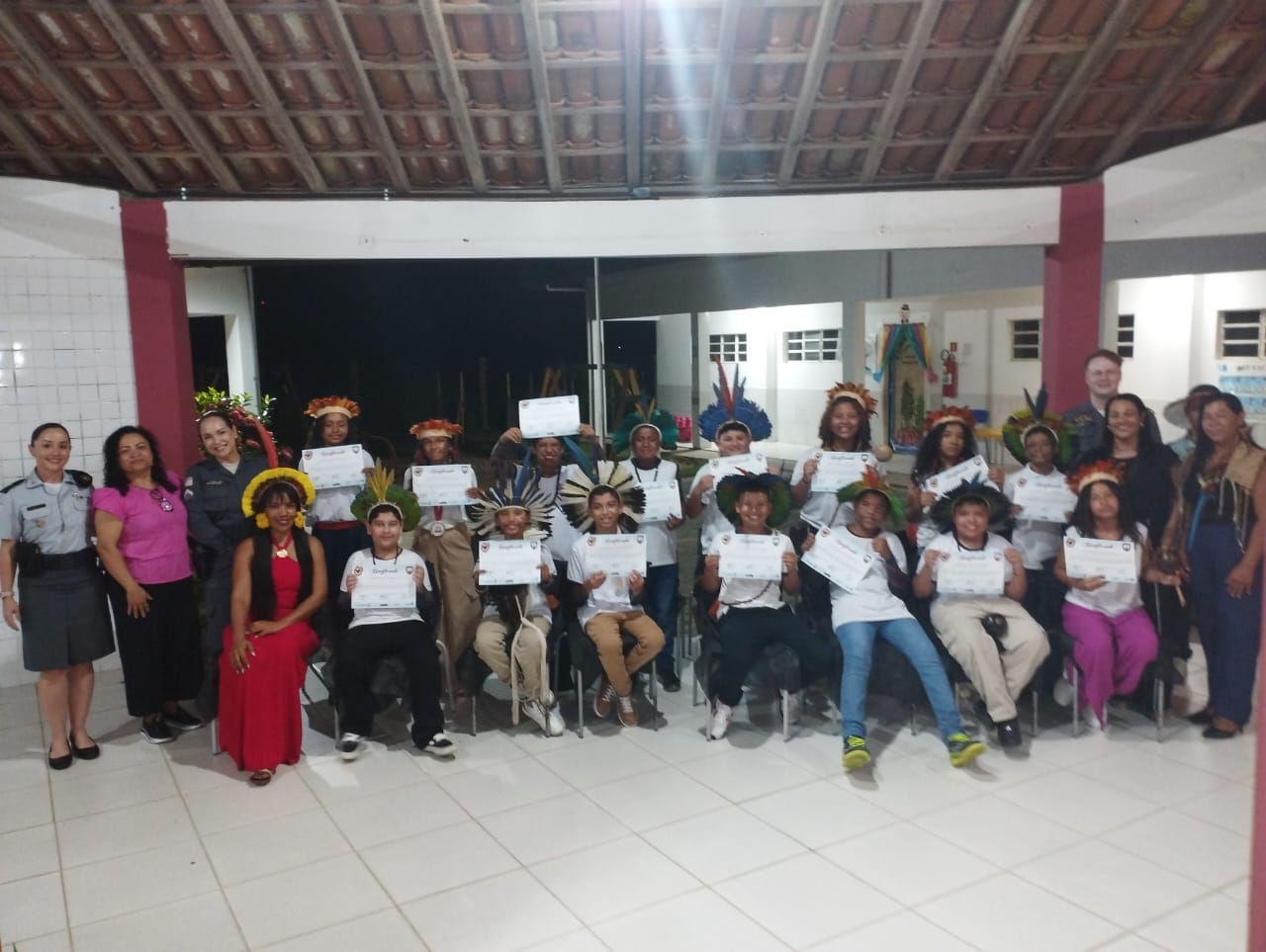 O evento, que certificou 16 estudantes, foi o último de 2025, encerrando um ciclo de 13 formaturas, totalizando 1178 crianças e adolescentes assistidos na ação. A cerimônia se iniciou com uma bela apresentação dos estudantes formandos, que na língua nativa, cantaram e tocaram seus instrumentos como o chocalho, o tambor e a casaca. Em seguida, representando a comunidade, a cacique Marcela Rocha deu as boas vindas aos familiares presentes, destacando como as aulas do Proerd ajudaram as crianças de sua aldeia.