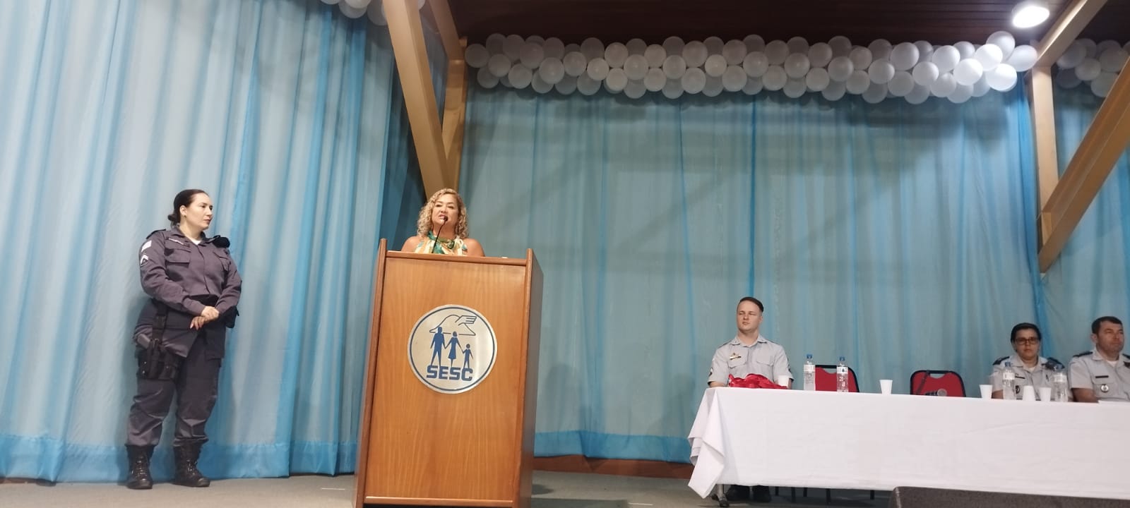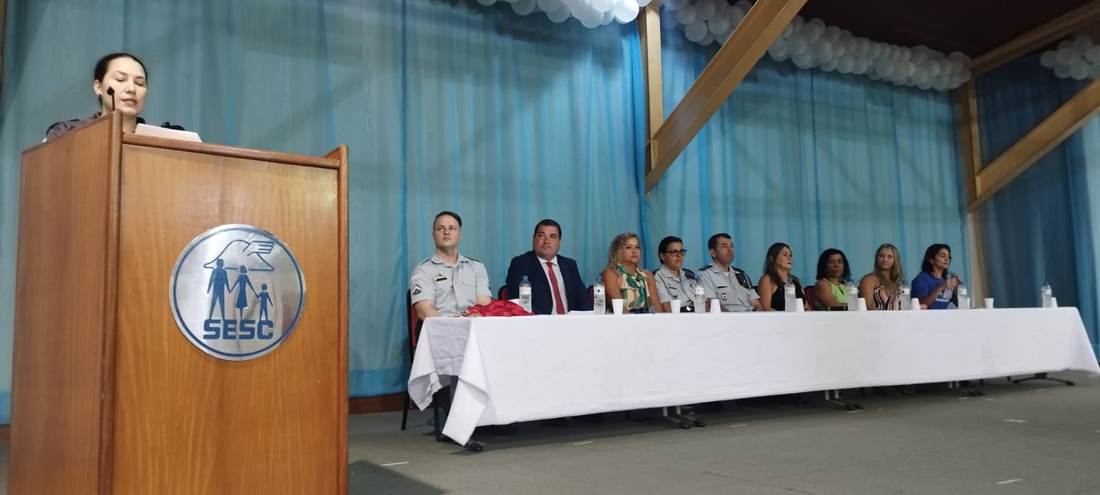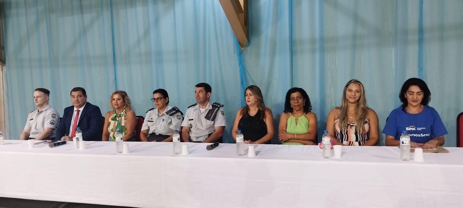Compuseram a mesa das autoridades, representando o 5º BPM, o Major Márcio Cabral, a 1ª Tenente Carla Silva (Coordenadora do PROERD) e o Cabo PM Martin Westphal Kelbert (Instrutor do PROERD), além da secretária da Semed, Jenilza Spinassé, a Pedagoga e Técnica da Semed, Giucirlene Pereira de Bortoli, o vereador André Carlesso, as diretoras Vânia Recla Fracalossi (Emef Zilca Bermudes), Débora Amorim Gomes Barbosa (Emef Luíza Silvina), Karla Lorena do Centro Educacional Pensar e a professora do Sesc, Luciana Ribeiro.