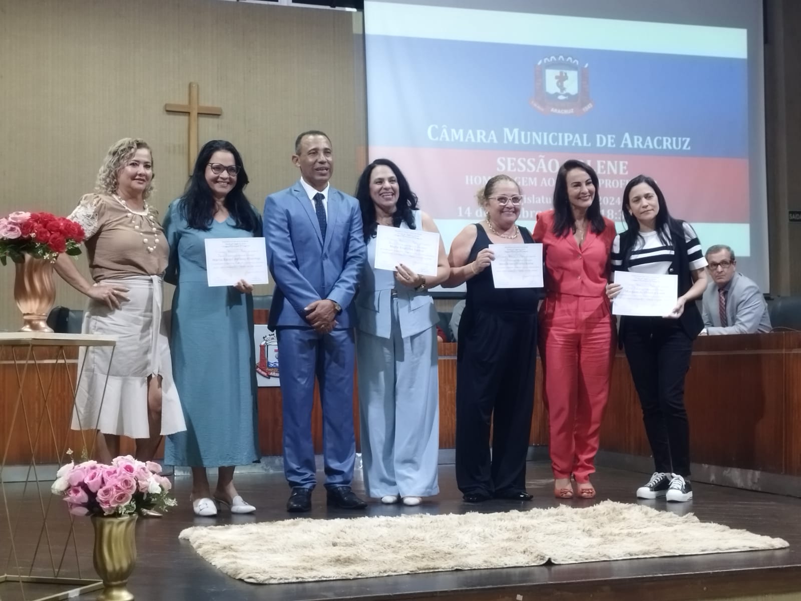 Após as falas das autoridades, um a um os professores foram chamados à frente para receber das mãos dos vereadores e das secretárias os certificados pelo reconhecimento de seus trabalhos nas escolas da rede. Ao final, a secretária Jenilza Spinassé também foi homenageada com um buquê de flores pela sua dedicação e trabalho em prol de uma educação pública de qualidade.