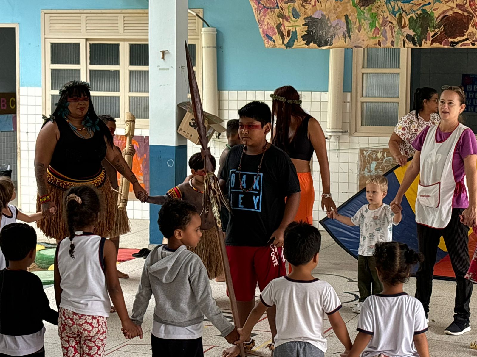 Ainda de acordo com Adriana, a presença dos indígenas e do cacique Jonas do Rosário e esposa deixaram cada criança e bebê maravilhados. “A chegada dos indígenas em nossa escola encantou a todos com suas pinturas corporais, instrumentos musicais e danças. Foi gratificante ver os sorrisos nos rostos de nossos estudantes. Muito obrigada à aldeia Areal por ter nos proporcionado essa incrível experiência e encantamento”, comemorou.