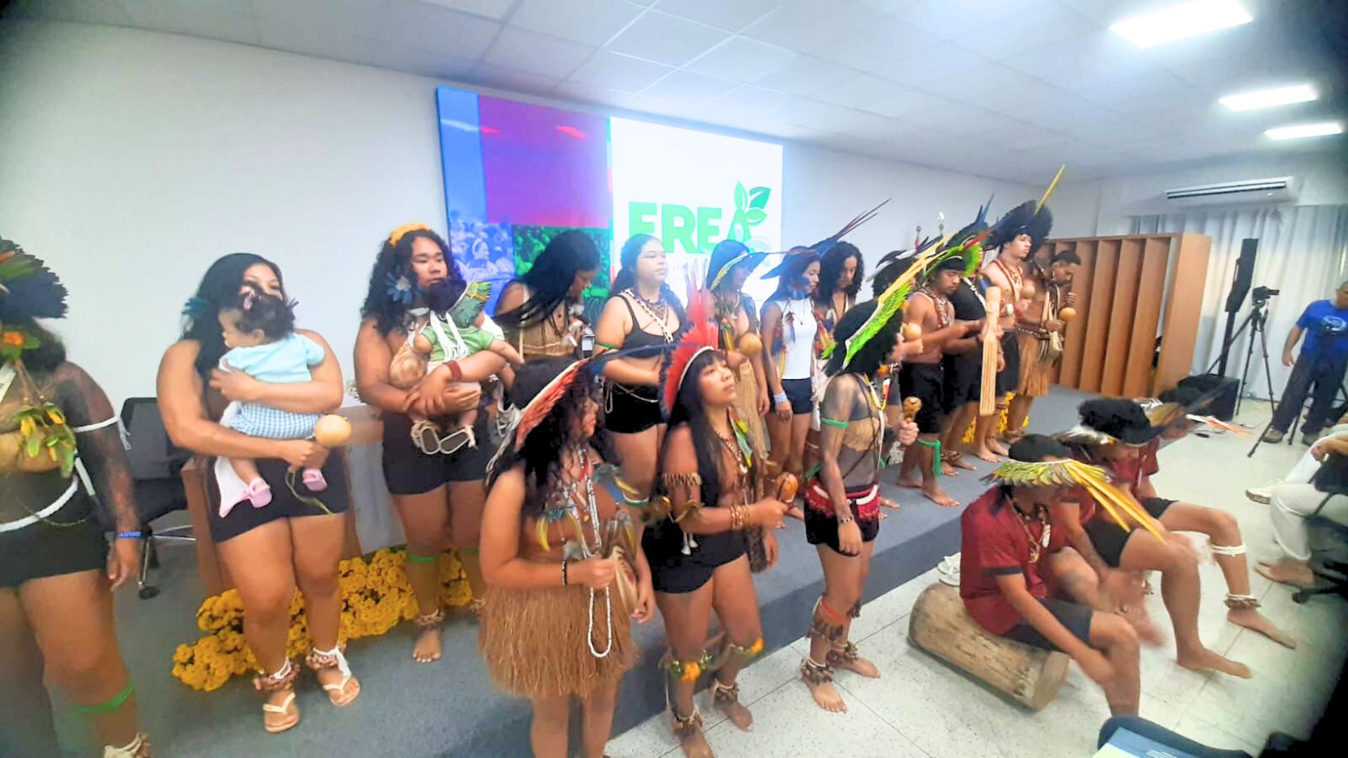 Já dentro do auditório, antes mesmo da apresentação e falas das autoridades presentes, o público, que compareceu em peso, pôde apreciar um belíssimo momento cultural do Grupo Tupinikim 'Guararatã da Juventude' da aldeia Irajá. Sob a coordenação do indígena Leonardo, 17 jovens cantaram e tocaram seus tradicionais instrumentos musicais.