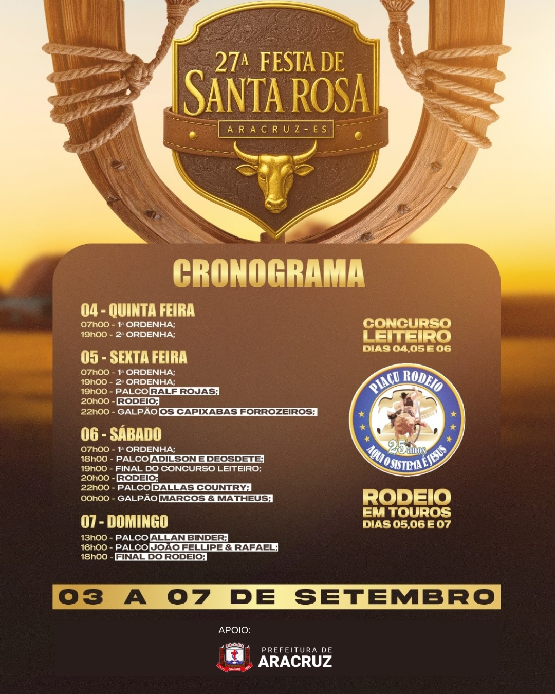 O prefeito Dr. Coutinho falou sobre a oportunidade que o evento proporciona para a região. “Este evento é uma grande oportunidade de valorizar nossas tradições, movimentar a economia local e fortalecer o turismo e o comércio da região. Quero agradecer a todos os envolvidos e à comunidade de Santa Rosa, que trabalham com dedicação para que esta festa aconteça com a grandiosidade que ela merece”.