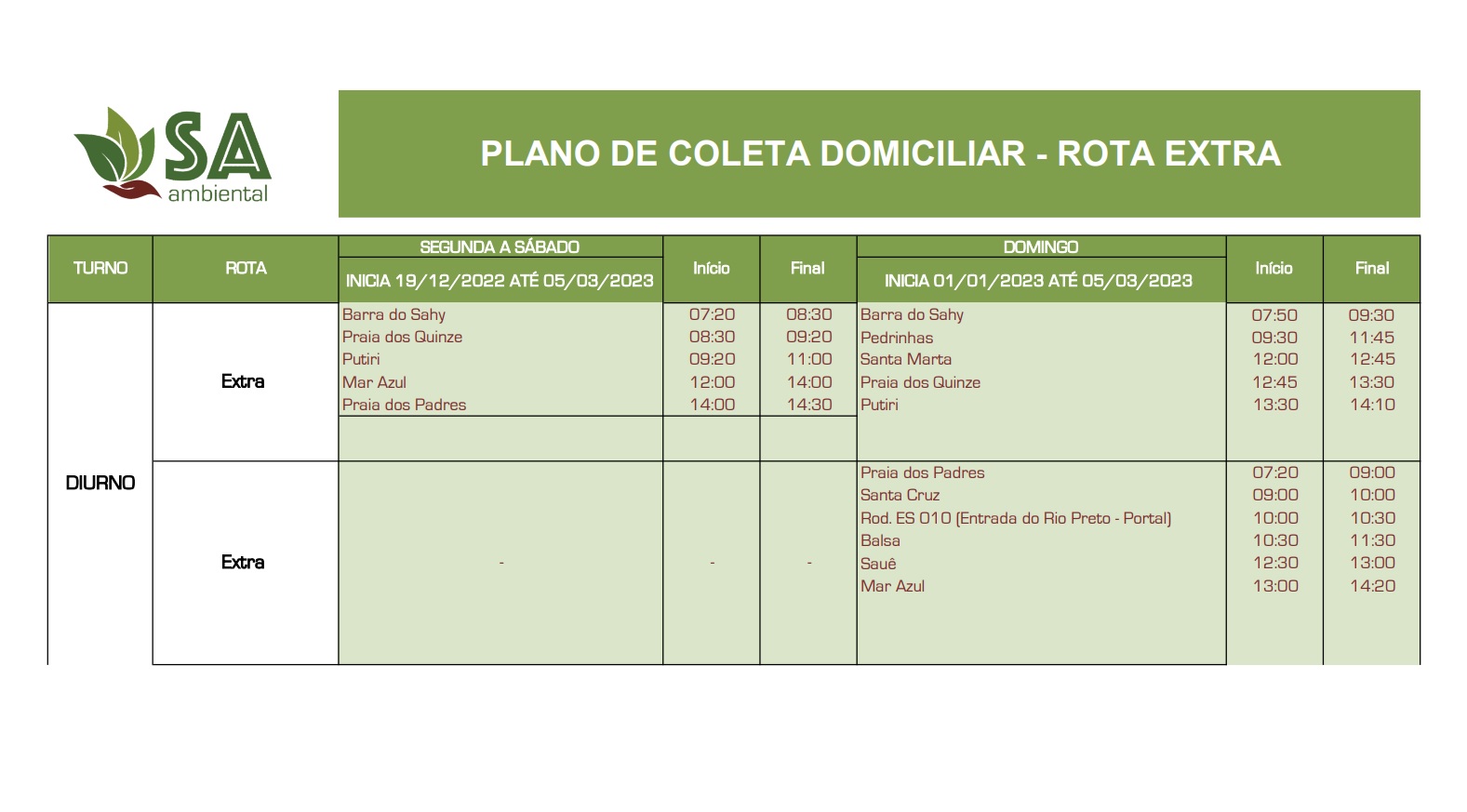 Com o objetivo de atender as demandas referentes à coleta do lixo domiciliar na alta temporada no litoral do município, a Secretaria Municipal de Transportes e Serviços Urbanos (Setrans) está atuando de segunda a sábado, desde o dia 19 de dezembro até 5 de março, e domingo, de 1º de janeiro até 5 de março.