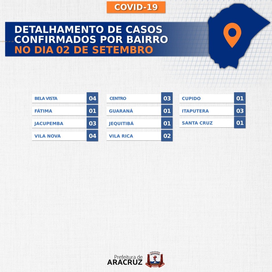 O município de Aracruz registrou 24 casos confirmados de Covid-19. Os bairros dos casos confirmados de hoje podem ser conferidos no segundo card desta publicação.