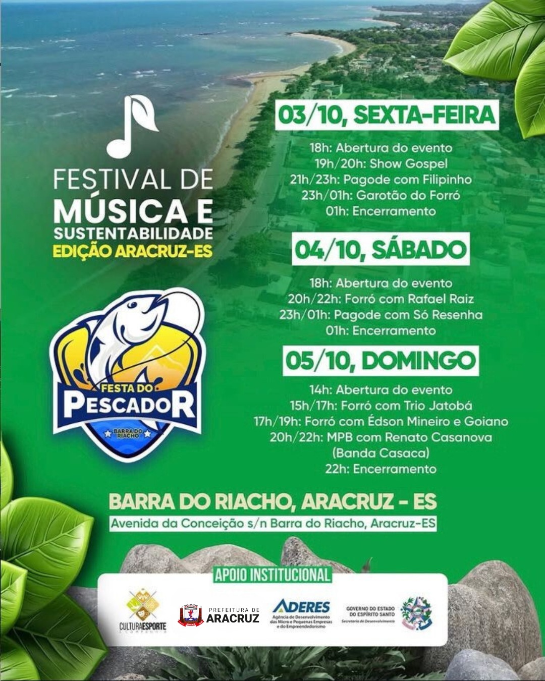 Neste final de semana acontece também a tradicional Festa dos Pescadores pelo Instituto Cultural Esporte e Companhia com apoio da Semtur. O evento acontece de 03 a 05 de outubro a partir das 18h, na avenida da Conceição em Barra do Riacho, Aracruz.