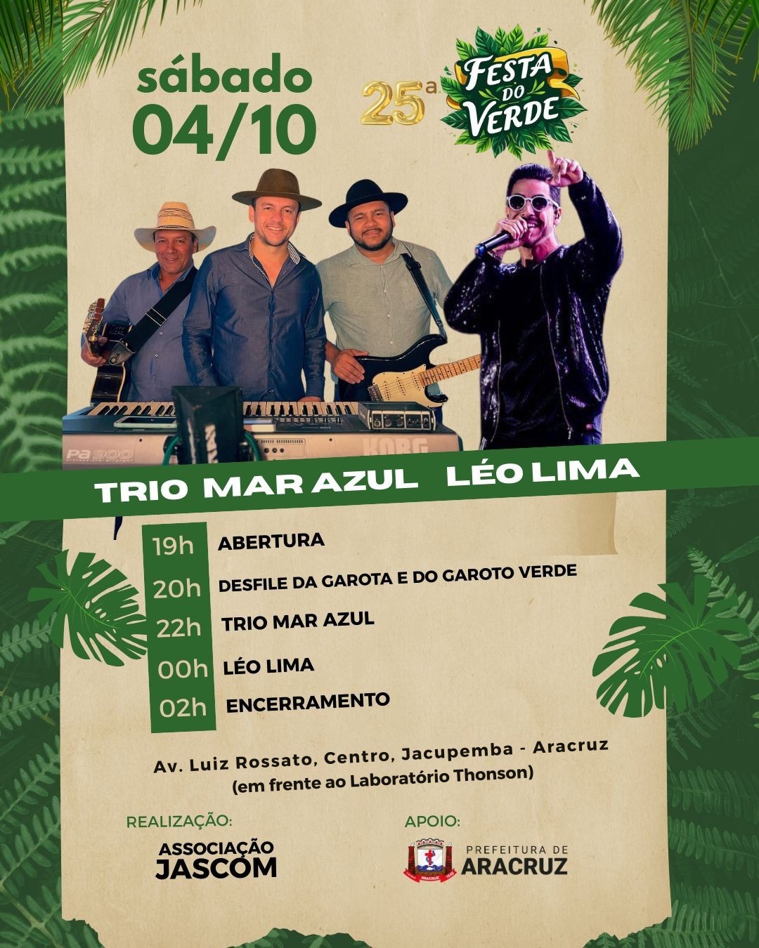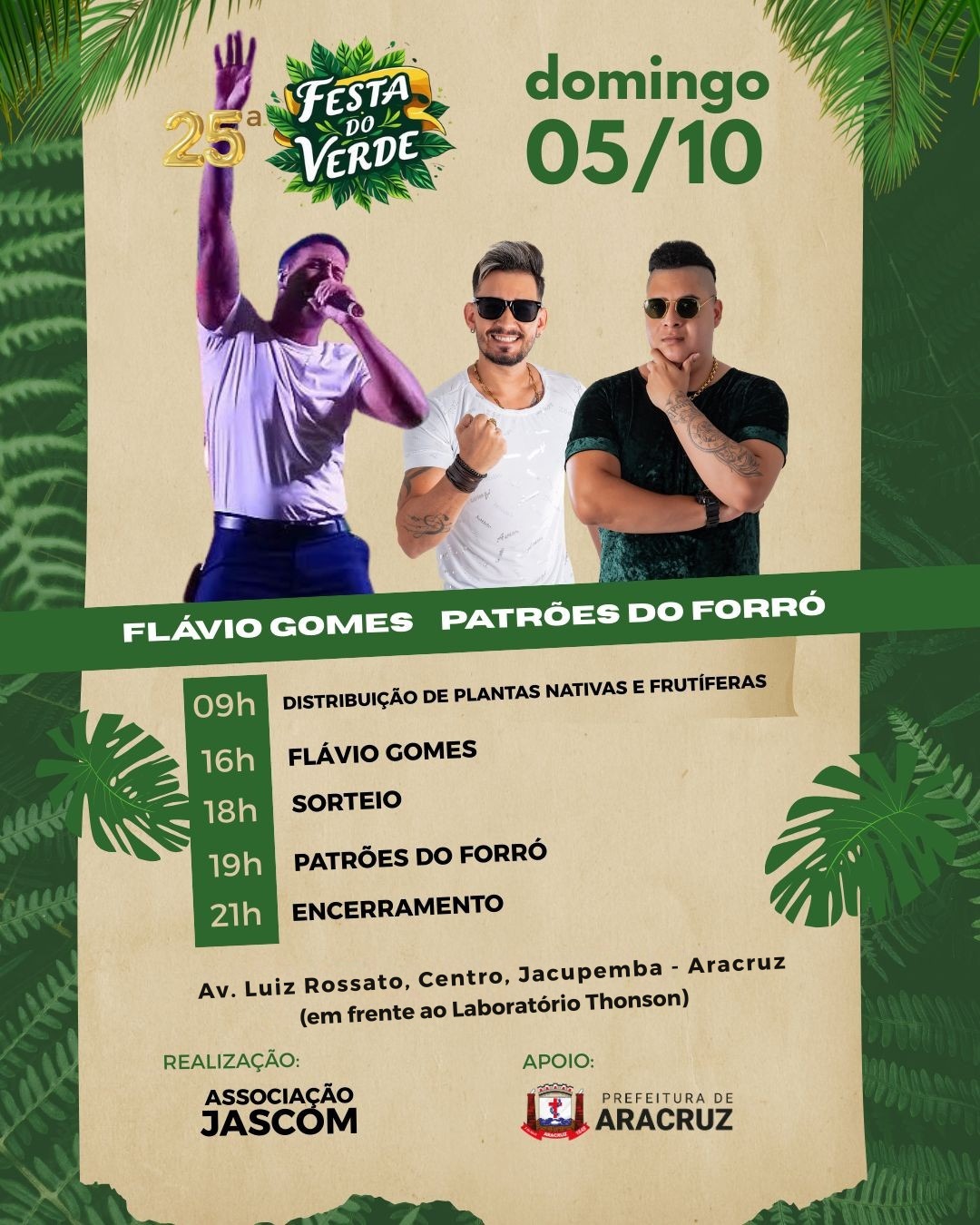 A próxima edição da tradicional Festa do Verde organizado pela Associação Jovens Amigos a Serviço da Comunidade (Jascom) com apoio da Prefeitura de Aracruz, por meio da Secretaria de Turismo e Cultura (Semtur) será neste final de semana. A Festa faz parte do Calendário Oficial de Eventos do Município, em reconhecimento a importância que esse evento adquiriu ao longo dos anos. O evento acontece nos dias 04 e 05 de outubro, a partir das 19h, na avenida Luiz Rossato, centro em Jacupemba.