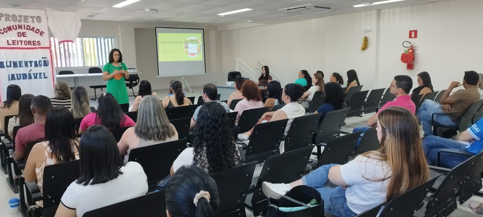 A pedagoga Rosângela Ramos e a diretora do Cmei Sete Anões, Dilza Célia Rui, mostraram aos presentes como o Programa Comunidade de Leitores, ao trabalhar o tema da alimentação saudável, trouxe resultados incríveis para a educação e conscientização dos estudantes. “Como a alimentação saudável na infância é essencial para o desenvolvimento físico e cognitivo de nossas crianças, trabalhamos muito com o incentivo à leitura e à cultura alimentar, o que vem contribuindo para a formação de hábitos conscientes desde os primeiros anos de vida”, ressaltou a Rosângela.